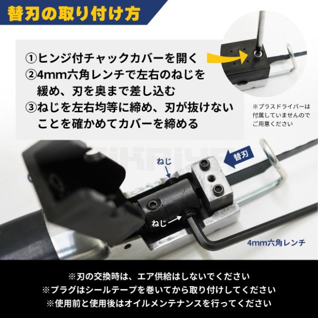 | セット内容 | ・エアーソー(本体)-1本 ・替刃6本(24山-3枚、32山-3枚) ・1/4PTスチールプラグ-1本 ・4mm六角レンチ-1本 ・2mm六角レンチ-1本 ・ガイドブレード-2本(本体付-1本、スペア-1本) |