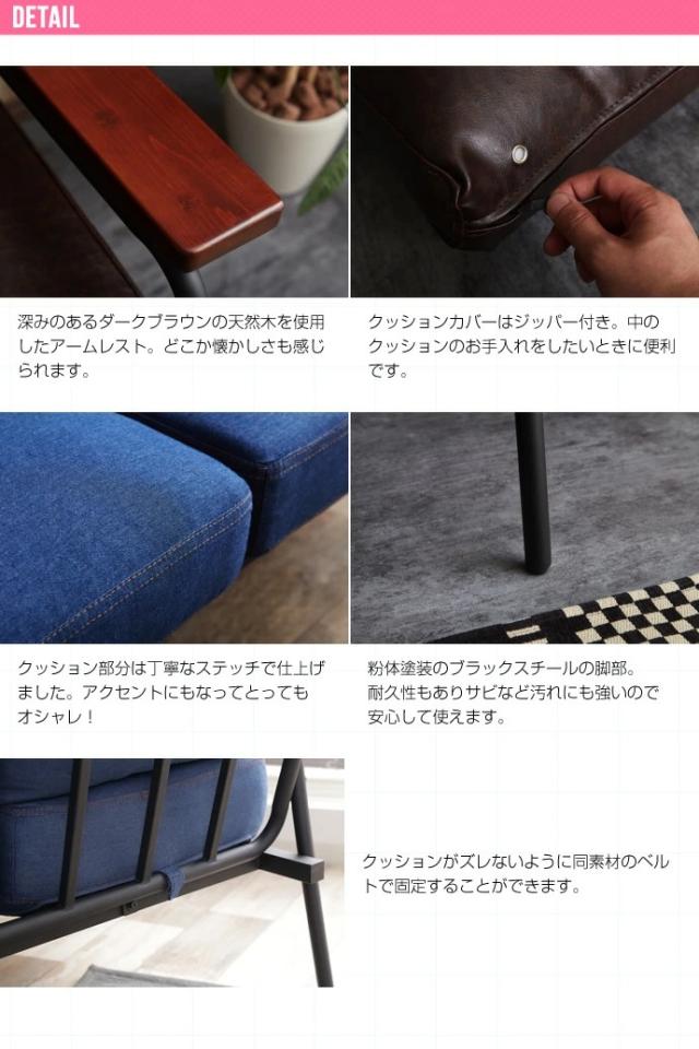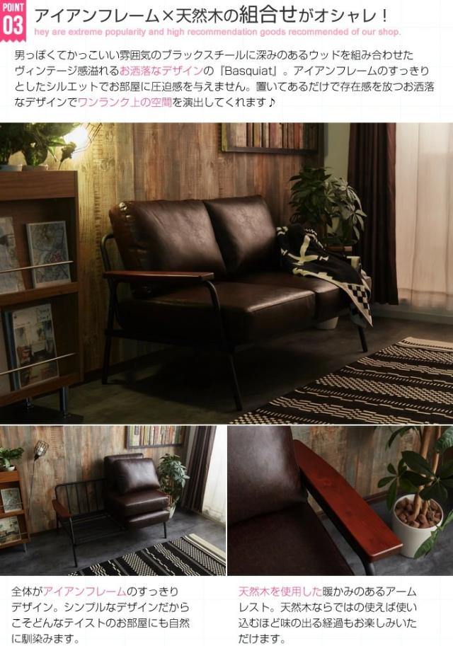 ブラックスチールのフレームと天然木の肘置きを組み合わせたヴィンテージ感あふれる大人な雰囲気の3人掛けソファ。