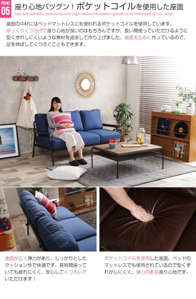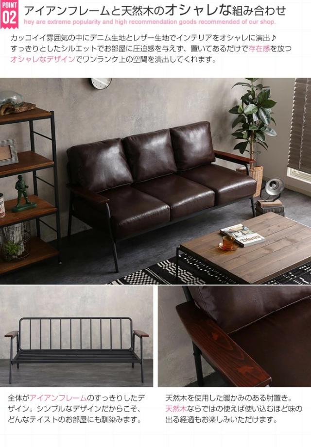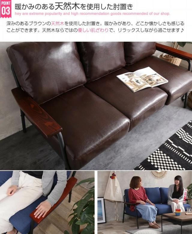 ブラックスチールのフレームと天然木の肘置きを組み合わせたヴィンテージ感あふれる大人な雰囲気の3人掛けソファ。