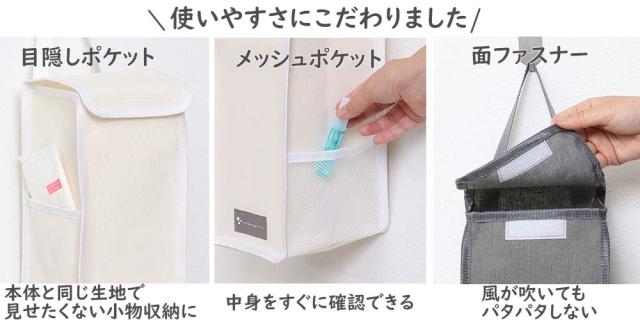 ●サニタリーグッズや除菌グッズ、小物を収納できるタイプの違うポケット付き。
