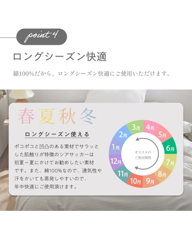 [keyword] カーテン ラグ 寝具 涼感 夏 外 おでかけ 洗濯機洗いOK 洗濯 綿100% 素材 無地 無地調 柄 かわいい おしゃれ シンプル ベーシック 定番 寝室 インテリア ベッドルーム 夏用 サマー 涼しい 一人暮らし 大学生 社会人 ワンルーム 1K 1DK 新生活 [comment] 夏の定番素材でもあるシアサッカー!ポコポコとした凹凸がサラリと快適なシリーズです!優しい色合いがお部屋に馴染むボックスシーツ一体型敷きパッドです。