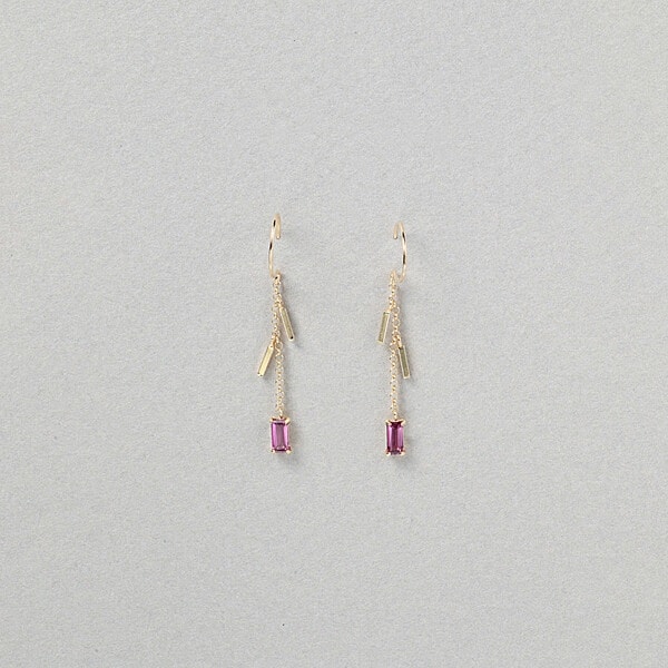 耳元でカラーストーンが揺れるイエローゴールドのピアス。