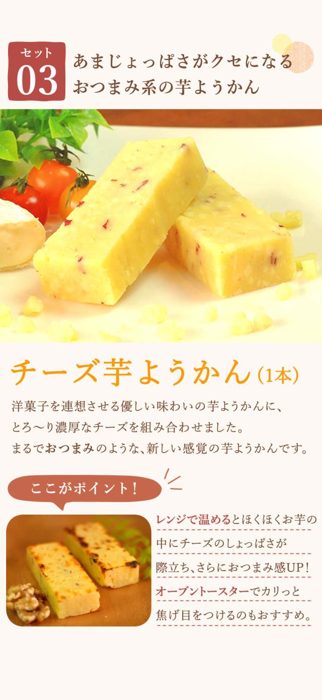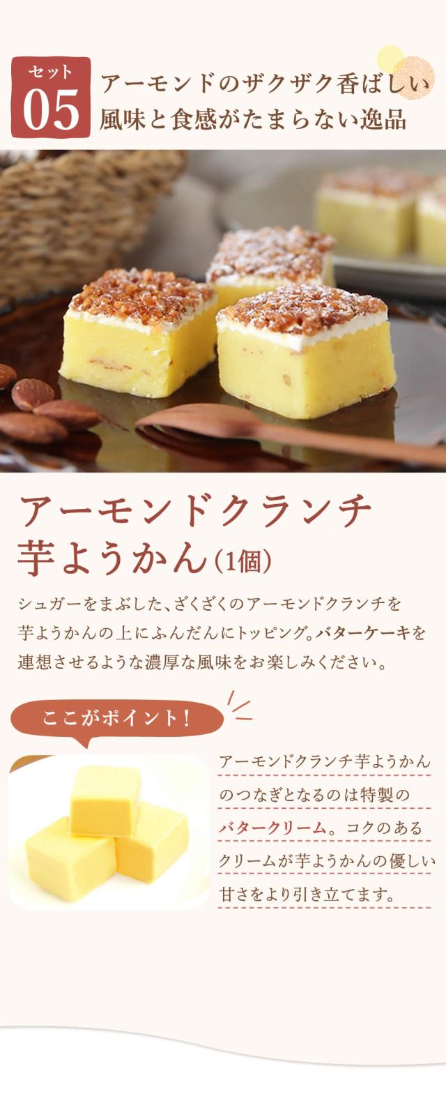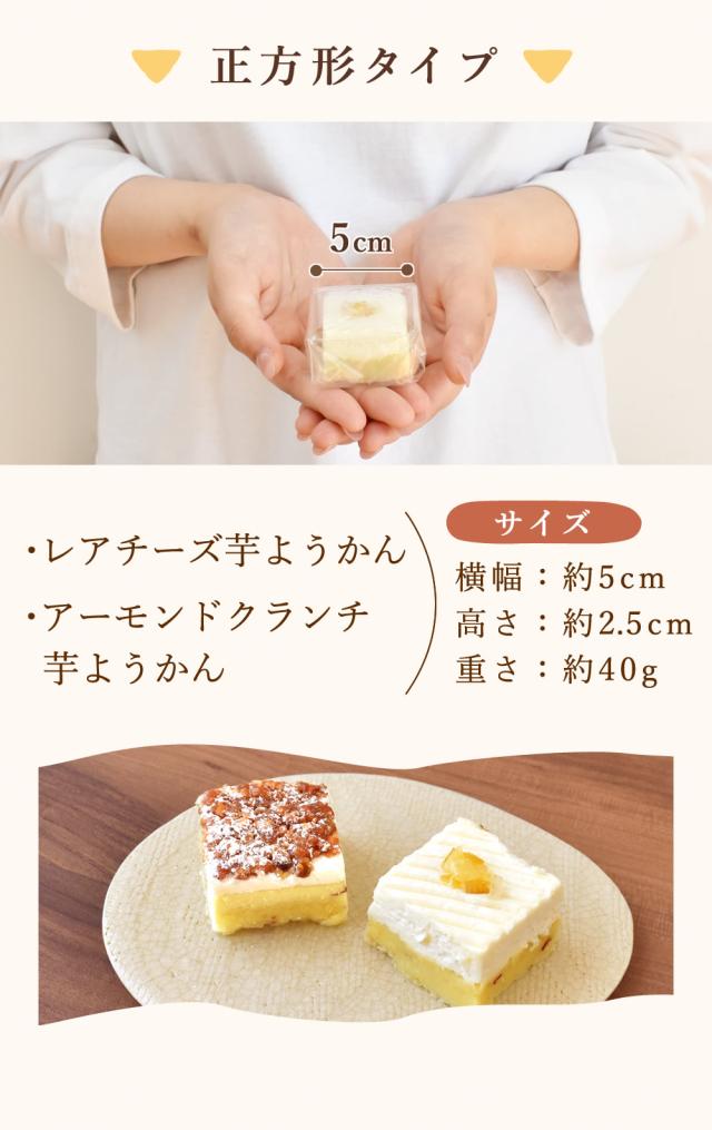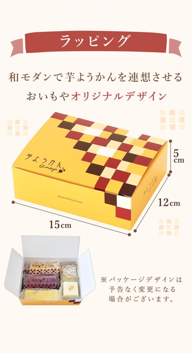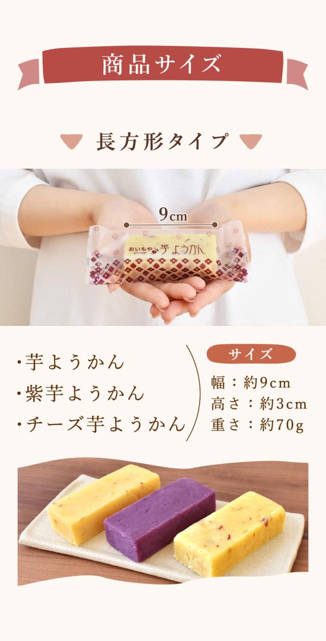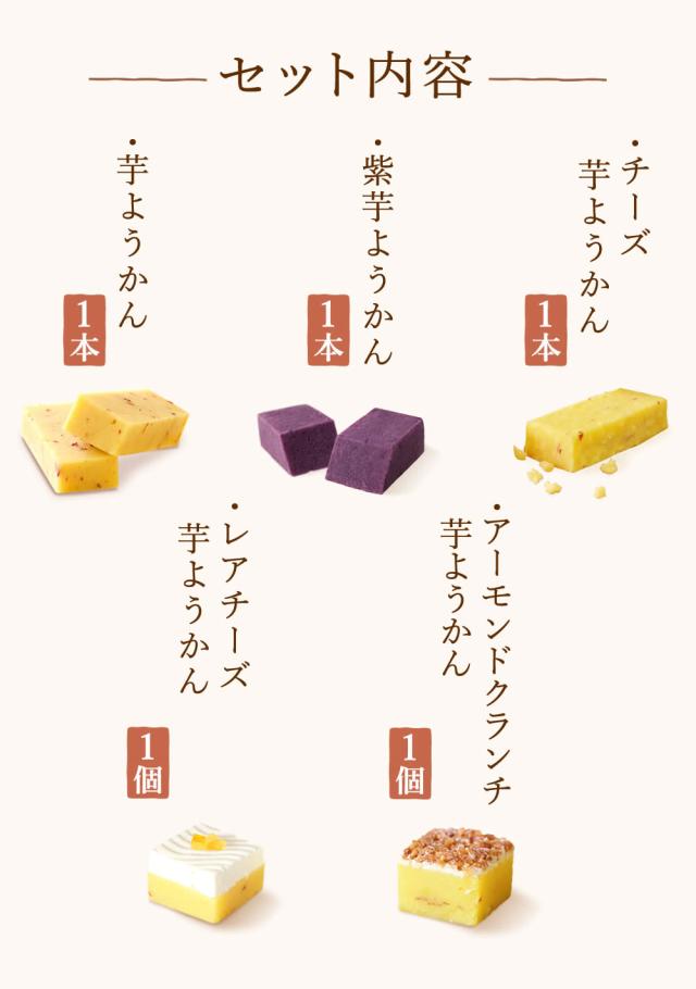 ・芋ようかん 1個 (1本辺り約70g、長さ9cm前後) ・紫芋ようかん 1個 (1本辺り約70g、長さ9cm前後) ・チーズ芋ようかん 1個 (1本辺り約70g、長さ9cm前後) ・レアチーズ芋ようかん 1個 (1個辺り約40g、幅5cm前後) ・アーモンドクランチ芋ようかん 1個 (1個辺り約40g、幅5cm前後) ●BOXサイズ:18cm×12cm×5cm |