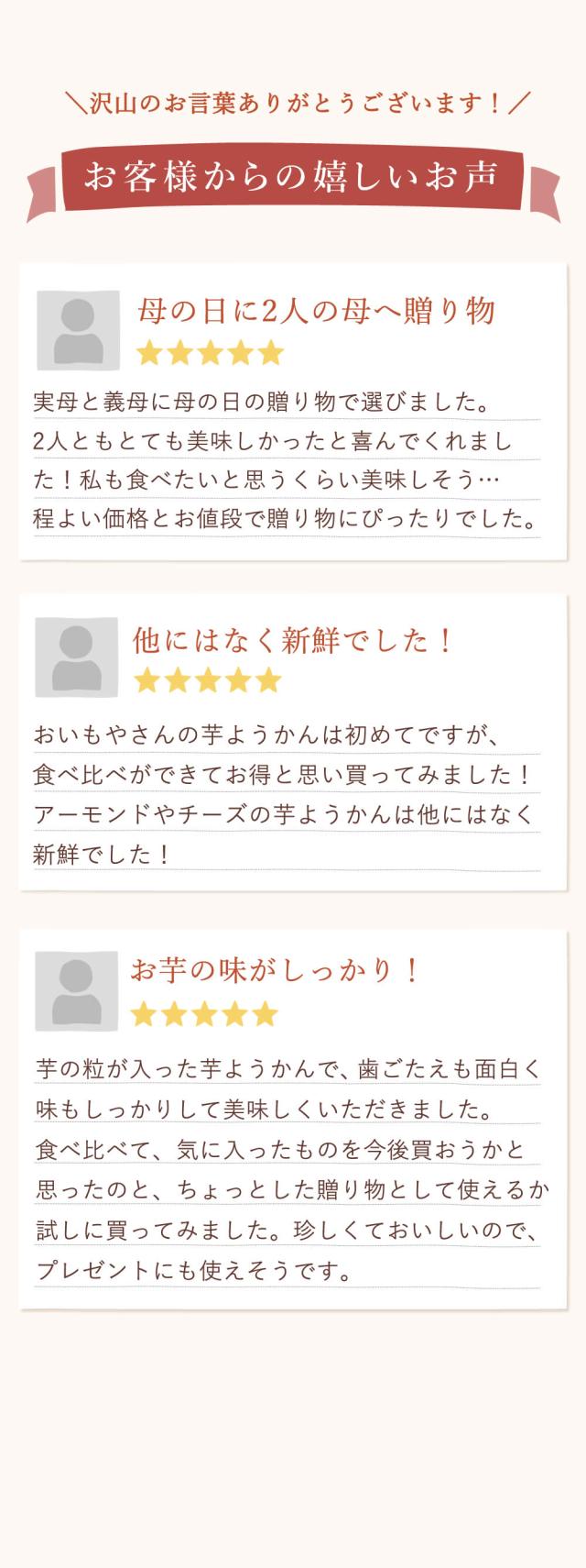 - 食べてみたかったおいもシリーズ、いろんな種類を試せるのがよいですね。母と二人でとても美味しくいただきました。