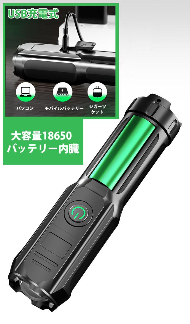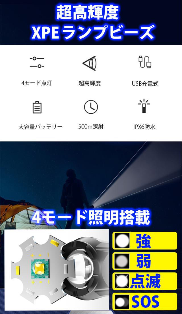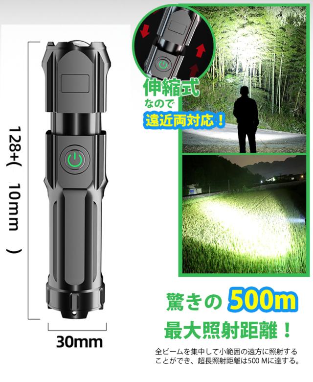 懐中電灯 ズーミングライト 4モード 点灯 強力照射 USB充電式 爆光 マルチ ハンディライト 照明 LEDライト 超小型ランプ 緊急 災害 500m 照射