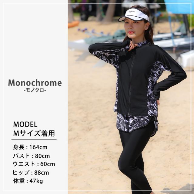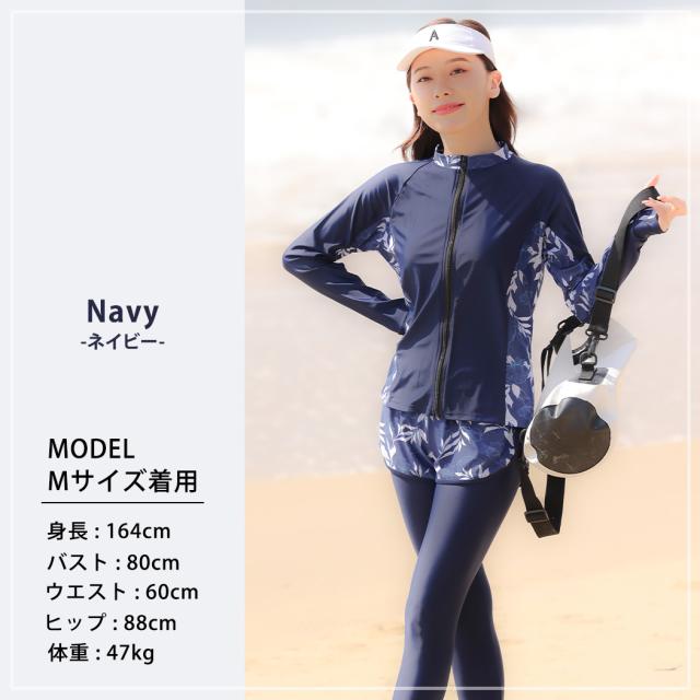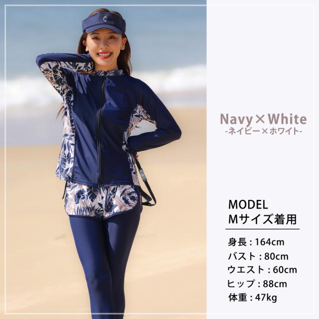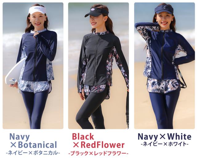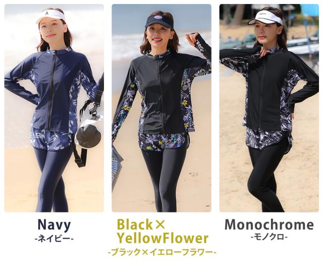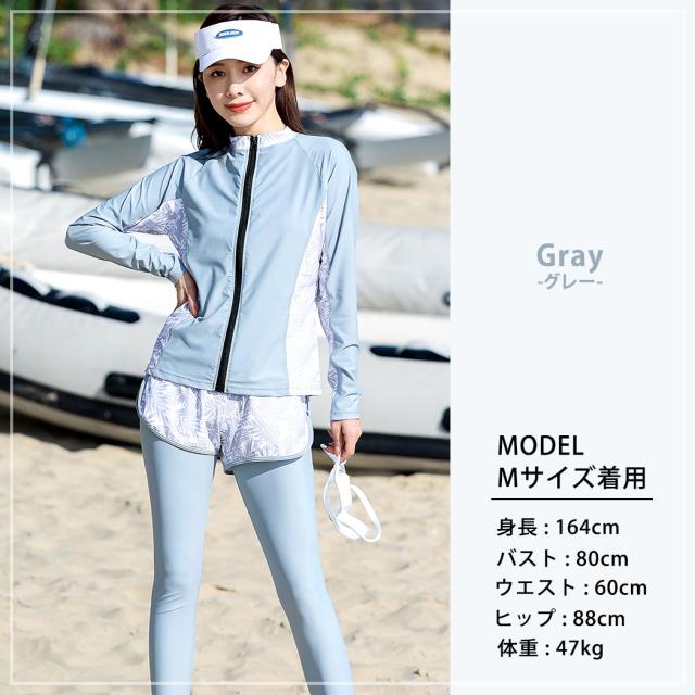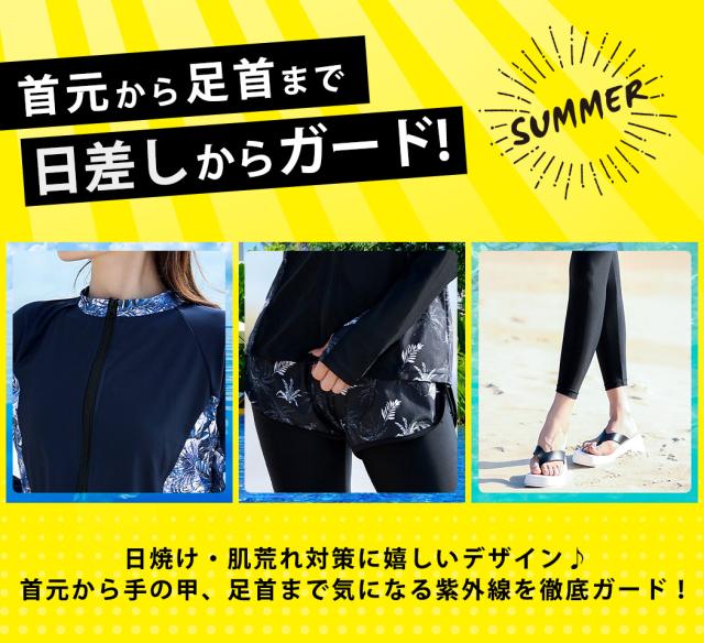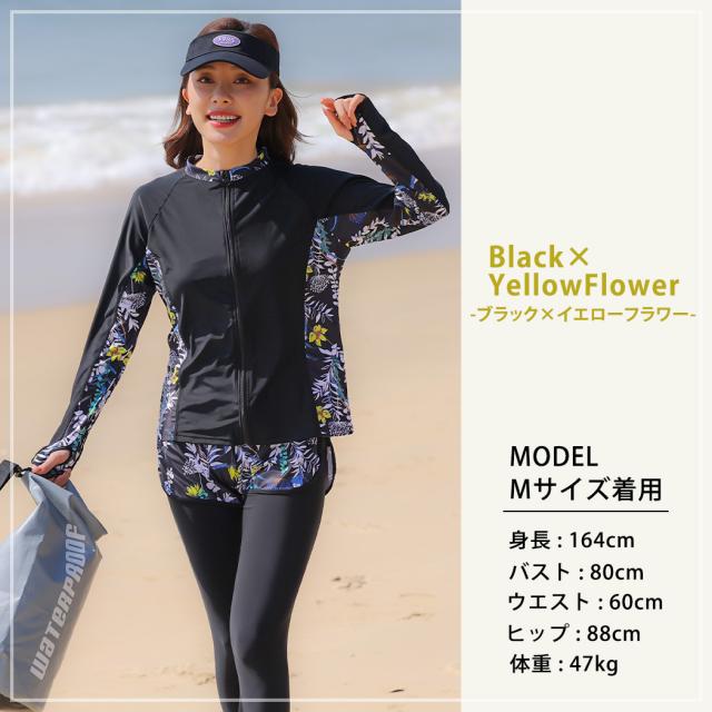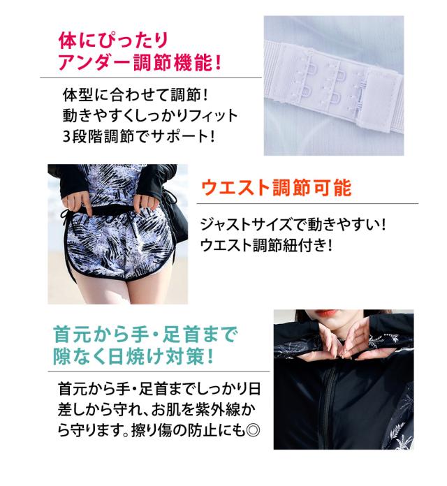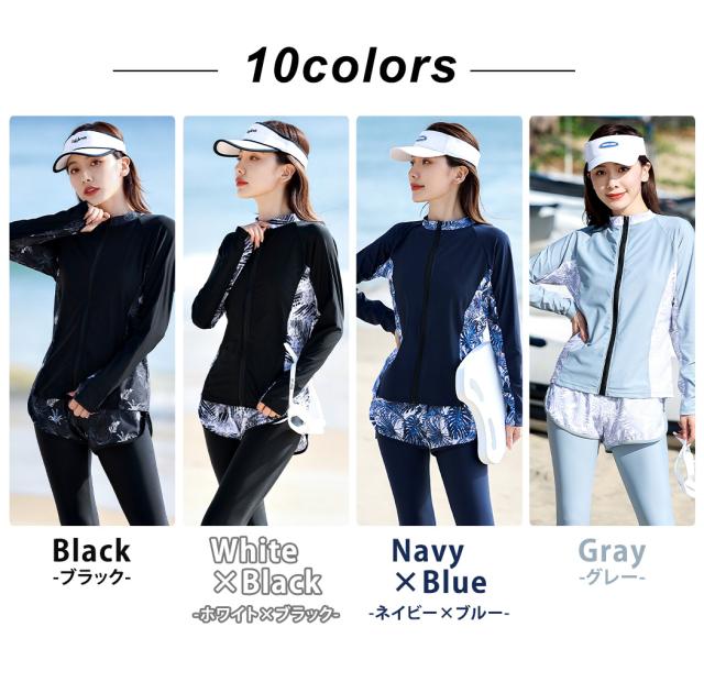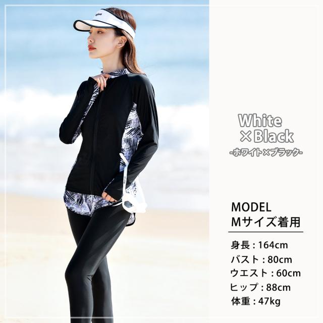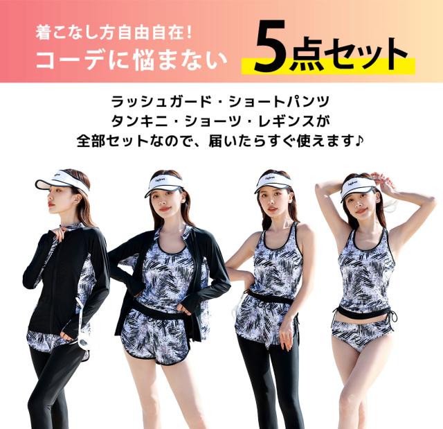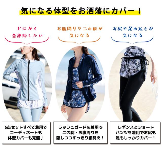 水着 レディース 体型カバー フィットネス大きいサイズおしゃれ 長袖 ラッシュガード タンキニ ショートパンツ レギンス 5点セット 黒 白 フロントジッパー ジップアップ パッド付き バスト 盛れる 二の腕 お腹 お尻 太もも 脚 カバーアップ