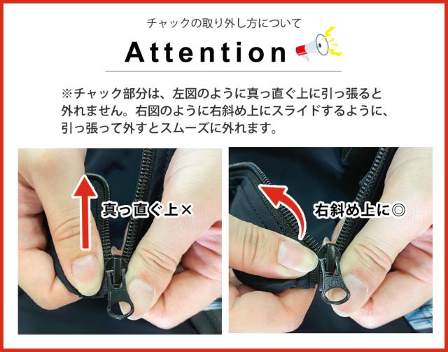 ※チャック部分は、左図のように真っ直ぐ上に引っ張ると外れません。