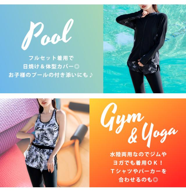 - レギンスは短いし日焼けするのでトレンカを別で購入 することをおすすめします 水に入ってタンクトップ水着を脱ぐこと想定すると洋服のサイズより1サイズアップがいいかなと思います 水着はいい品でした 痩せて...