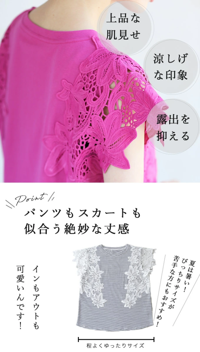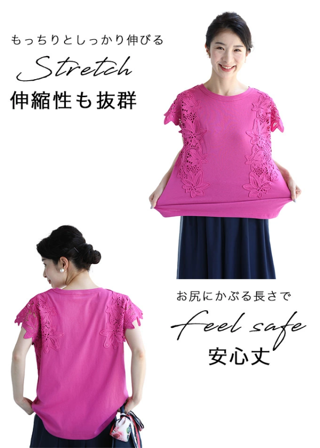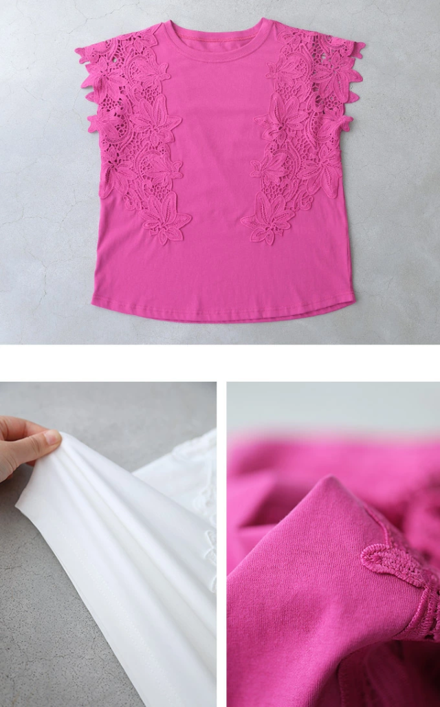 【閉店SALE】 花レース袖Tシャツ S~2L w54425ss cawaii Tシャツ 半袖 花 刺繍 春 夏 綿100% 涼しい 洗える フレンチスリーブ ドロップショルダー オフィス シアー袖 透け感 体型カバー 二の腕 お腹 ドルマンシャツ ゆったり 無地 春 夏