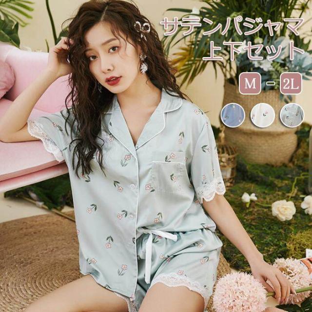 パジャマ レディース ルームウェア レディース 夏 ルームウェア セット レディース ルームウェア レディース 夏 サテン パジャマ 花柄 ナイトウェア 前開き 上下セット 半袖 短パン 部屋着 通気性 薄手 軽量 レース 上質な光沢感 なめらかな肌触り カジュアル 着痩せ イベント