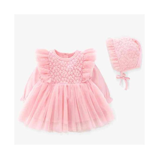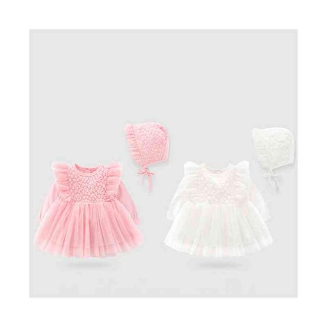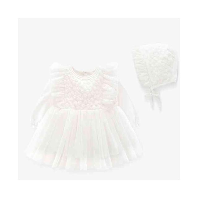 ベビー服 サマーセレモニードレス +帽子 セット 長袖 肩フリル レース 綿 コットン 新生児 女 退院着 出産準備 フォーマル お宮参り 退院 写真撮影 百日祝い 誕生祝い 全3色