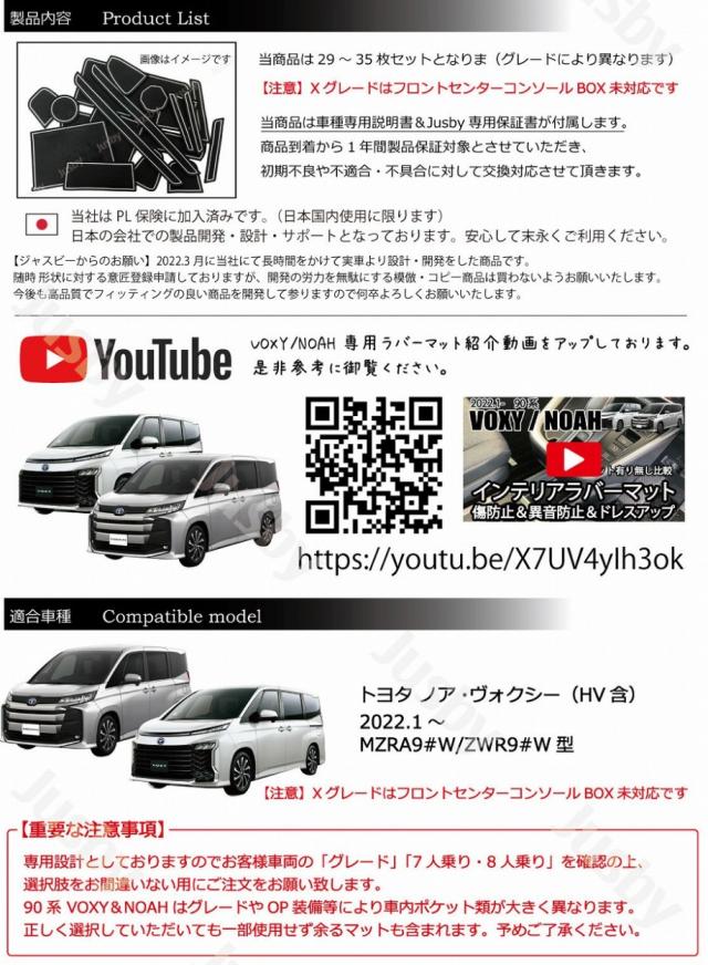 | トヨタ 90系 ヴォクシー&ノア専用 インテリアラバーマットフルセットです。 車種専用設計のインテリアラバーマットです。 当社商品は日本設計となっておりセンターコンソールの一体型及び、独立型どちらも両対応となっております。グレードと乗車人数を確認の上、ご注文をお願いします。 スマートフォン等を置く場合等運転中のカタカタ音の防止やパネルへの傷防止、ドレスアップに最適です。 ドアポケット部等はプラスチック部が露出しており爪などで傷も付きやすい為、当マットで保護&ドレスアップできます。 完全オリジナル設計で時間をかけCADにて製図して製作しておりますのでフィッティングには自信があります。 全29〜35枚セットで内装ポケット部に装着可能です。(グレードによって枚数が異なります) 【重要な注意事項】 ・専用設計としておりますのでお客様車両の「グレード」「7人乗り・8人乗り」を確認の上、選択肢をお間違いない用にご注文をお願い致します。 90系 VOXY&NOAHはグレードやOP装備等により車内ポケット類が大きく異なります。 正しく選択していただいても一部使用せず余るマットも含まれます。。 ・XグレードはフロントセンターコンソールBOXが未対応です。その他部分は使用できます。 ・7人乗りG/S-Gは2列目センターテーブルが仕様としてマットを設置できません。 専用の取付説明書とJusby専用の製品保証書が必ず付属いたします。 1年間は不具合・不適合・初期不良に対しての製品保証を行いますのでご安心してお買い求めください。 またPL保険(製造物賠償責任保険)付きですので末永く安心してご使用いただけます。 ( ・∀・)Φスタッフレビュー 専用設計なのでフィッティングがとにかく良く純正の様に見えます。 携帯電話等車で充電しながらそのままパネルに置いていた部分にもラバーマットで保護できる為、携帯電話及び車両パネルにも優しく満足度が高い逸品です Jusby設計・開発のオリジナル商品です。デッドコピー防止の為、意匠登録申請済みです。(特許庁HPにてご確認ください) デッドコピーには「業者」及びコピー目的での購入者「個人」へ請求させていただきます。(Design Patent by Jusby [ 5939682 号] Jusby.,co.ltd) |