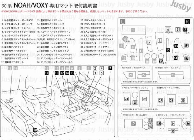 90系 VOXY&NOAHはグレードやOP装備等によりポケット類が異なります。 正しく選択していただいても一部使用せず余るマットも含まれます。