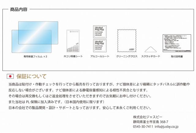 | ・車種専用専用保護フィルム&予備フィルム 計2枚 ・アルコールシート×2 ・スクラッチカード ・クリーニングクロス ・取付説明書 |