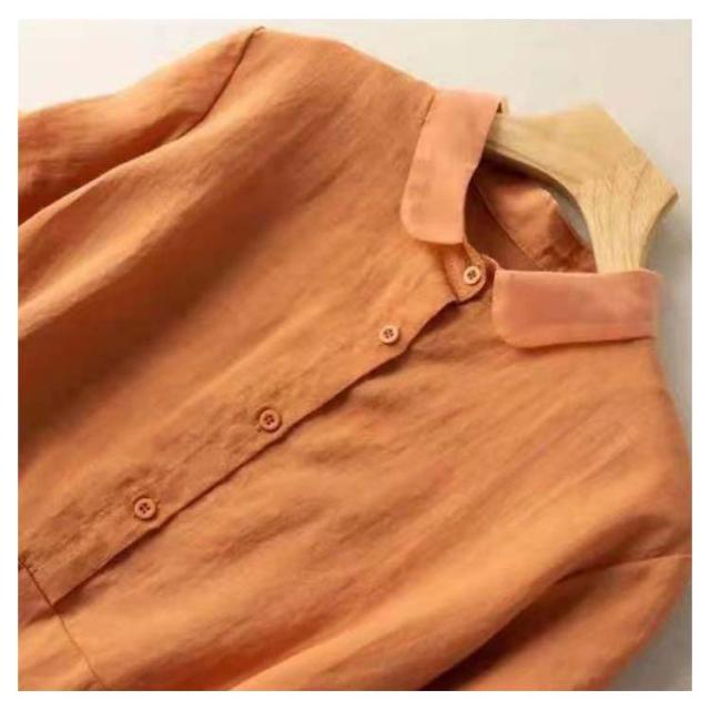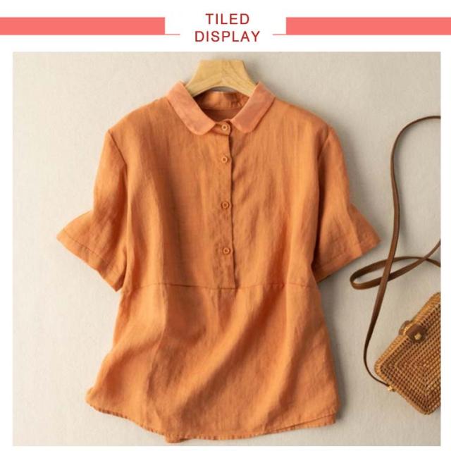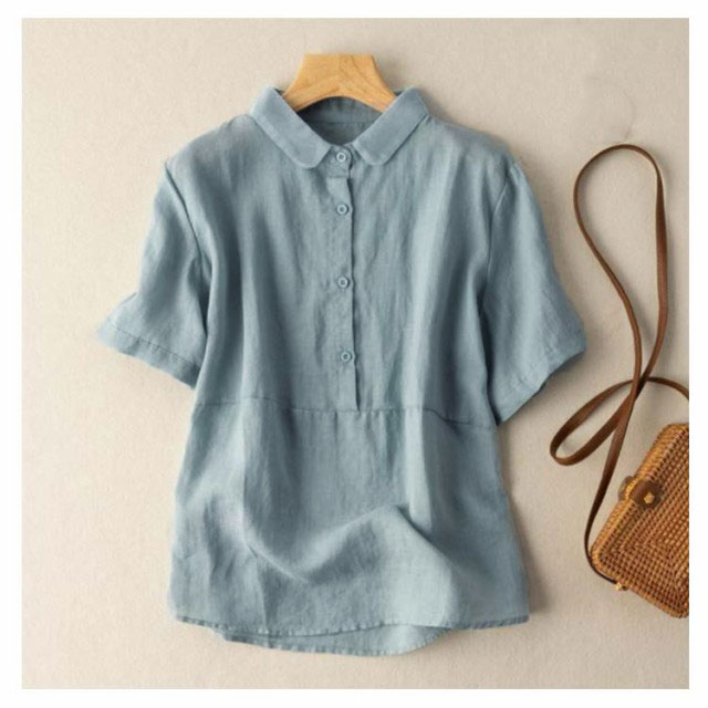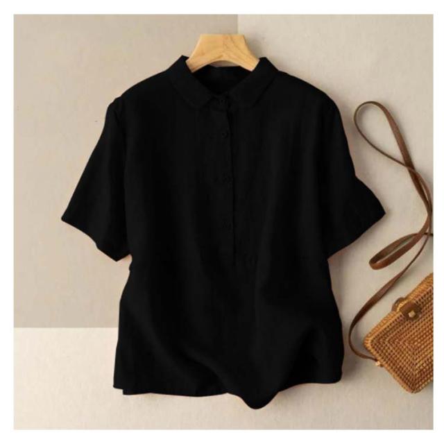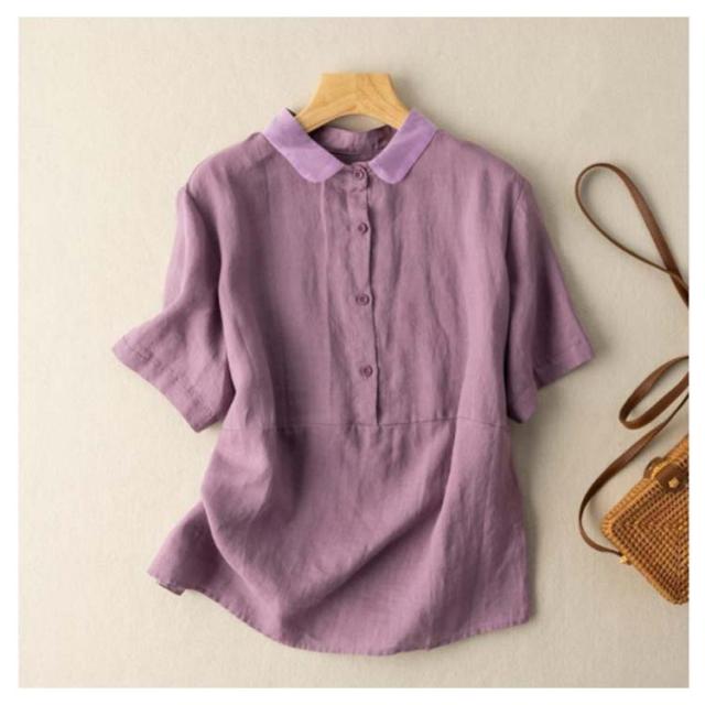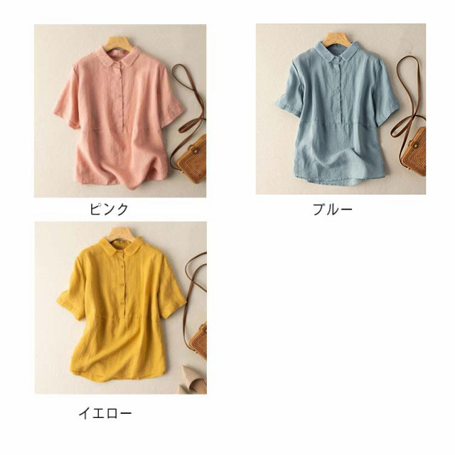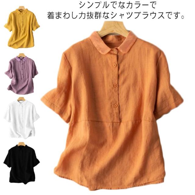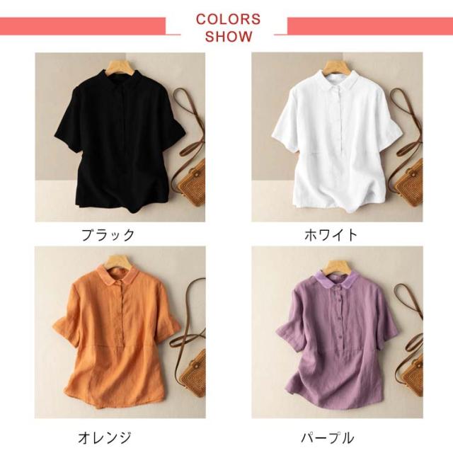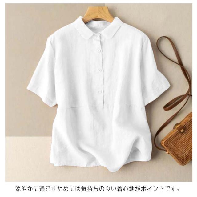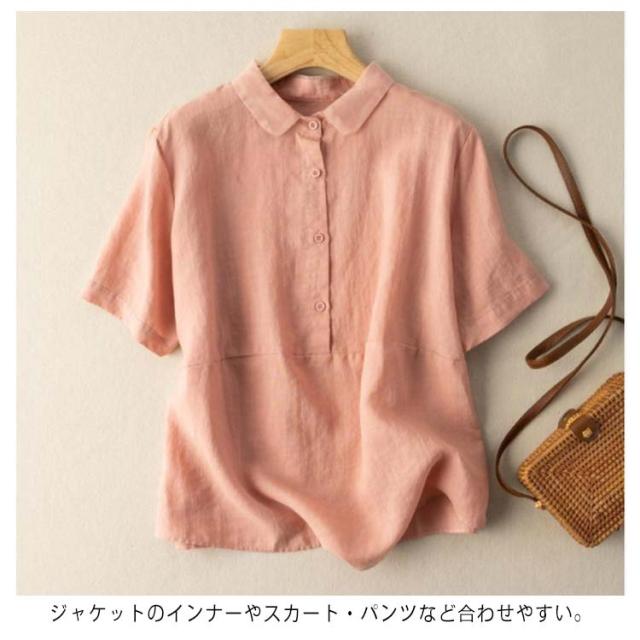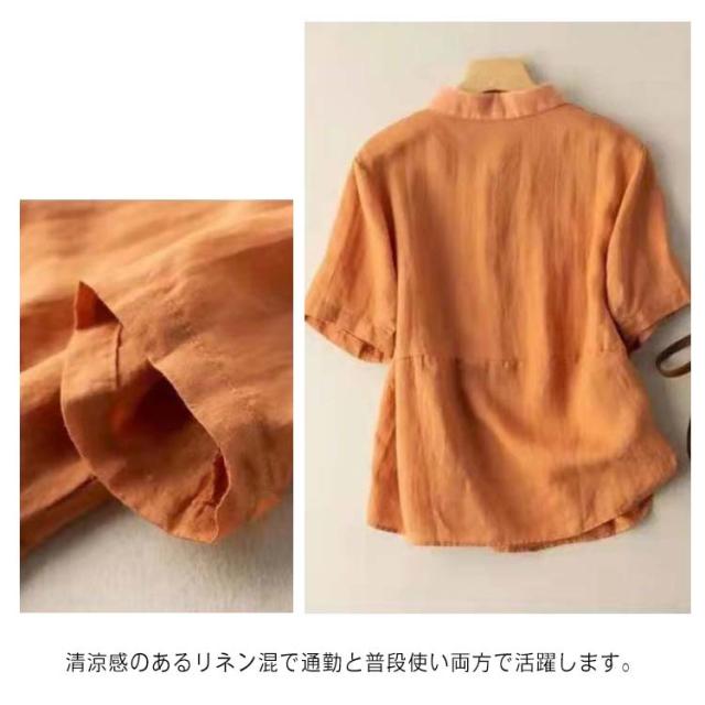 全7色×6サイズ ブラウス レディース 夏 半袖 綿麻 リネンブラウス トップス 無地 前開き 襟 異素材 Tシャツ カジュアル 体型カバー きれいめ ゆったり おしゃれ