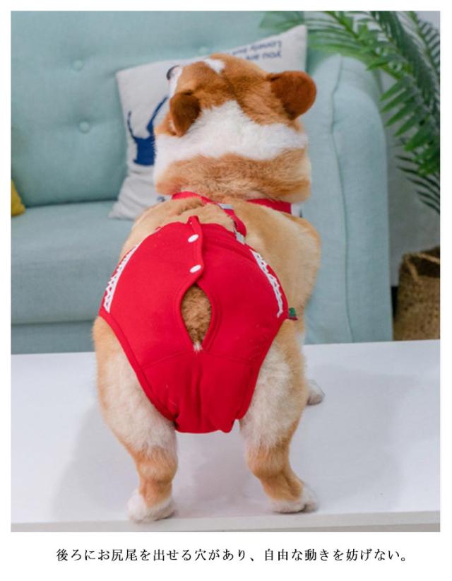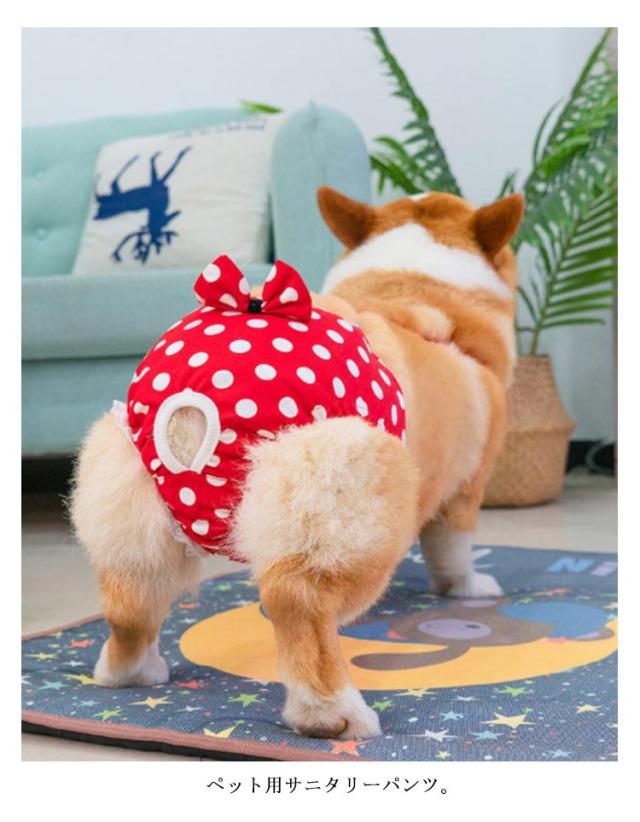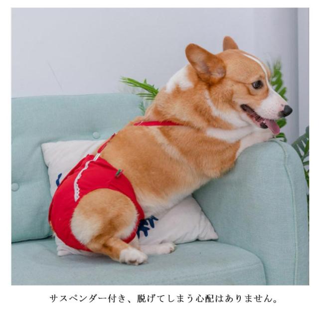 | ペット用サニタリーパンツ。 綿素材で快適な着心地。 後ろにお尻尾を出せる穴があり、自由な動きを妨げない。 洗濯機洗い可能。 サスペンダー付き、脱げてしまう心配はありません。 | |