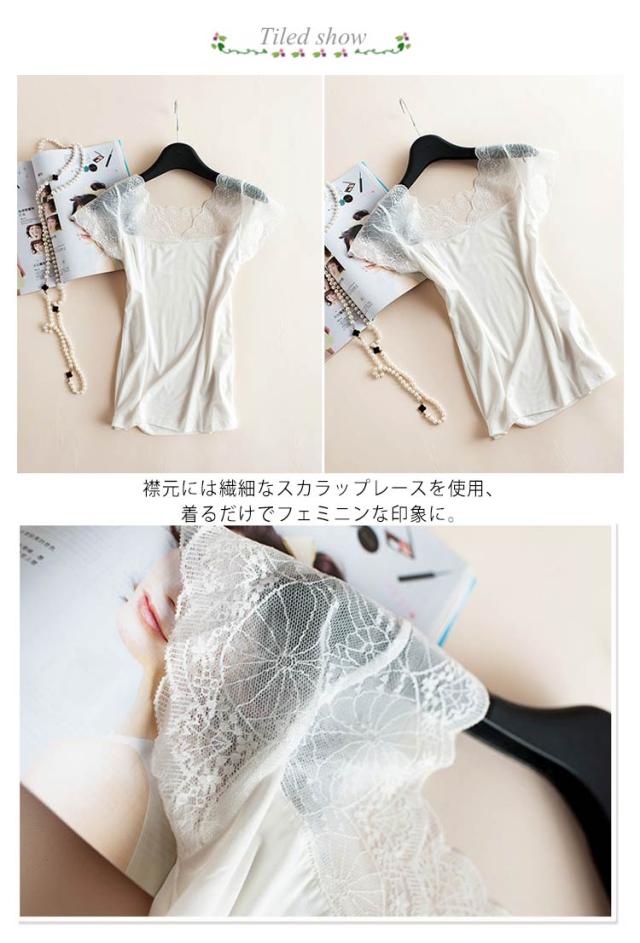 | スカラップレースで女性らしく華やかな印象に 襟元には繊細なスカラップレースを使用、着るだけでフェミニンな印象に。 伸縮性のある柔らか素材で素肌にも優しい 柔らかでしなやかな素材を使用。 伸縮性もあり、程よくフィットします。 さらっと1枚着た上に、ニットやカーディガンを羽織れば大人な雰囲気に。 チラ見せレースでガーリーな重ね着コーデにも。 | |