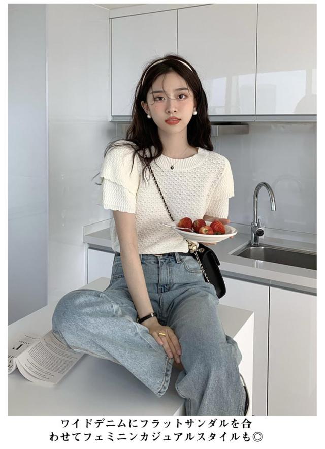 | 袖フリルが印象的なニットトップス 清涼感を感じるニット生地で、夏でも快適に着用して頂けます。 ワイドデニムにフラットサンダルを合わせてフェミニンカジュアルスタイルも◎ キレイめなボトムスを合わせればオフィスでも使えるので幅広いコーデに馴染みます。 | |