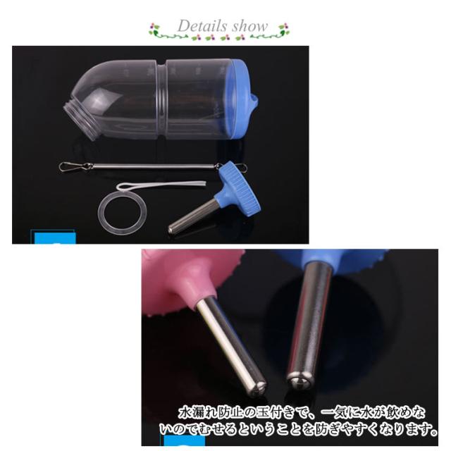 | 小動物用のゲージに簡単に取り付けられるウォーターボトル。 60ml、80ml、125ml、300mlと500mlの5サイズ展開、ウサギやハムスターなどの小動物に最適! 水漏れ防止の玉付きで、一気に水が飲めないのでむせるということを防ぎやすくなります。 フラットでスマートな、かさばらない省スペース設計です。 取り付ける場所や高さを自由に調節できます。 | |