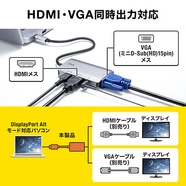 サンワサプライ USB Type C-HDMI/VGA変換アダプタ(4K/30Hz/PD対応) AD-ALCHV02