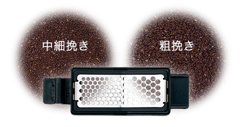 ミル出口のフィルターをつけ替えることで、「中細挽き」「粗挽き」の2段階に挽き目を調節できます。