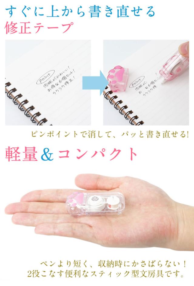 6個セット 修正テープ 肉球 ネコ 猫グッズ 黒猫 白猫 かわいい 文房具 プレゼント ギフト クリア 透明 文具 スリム コンパクト PR-ERASE11【メール便 送料無料】