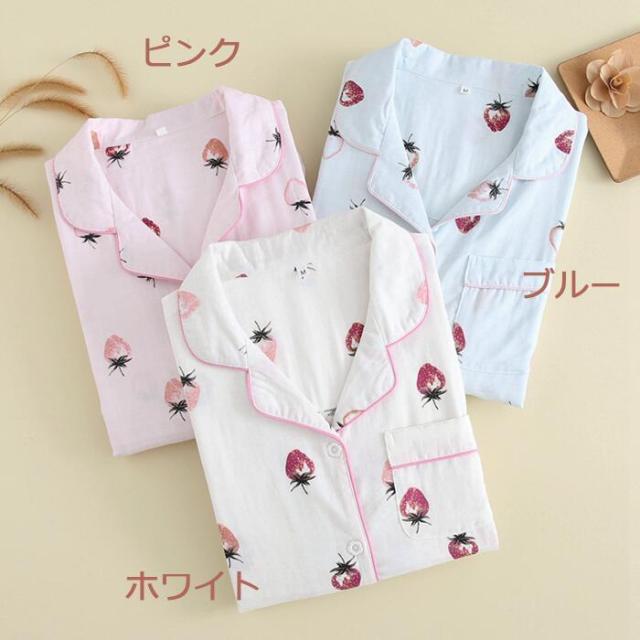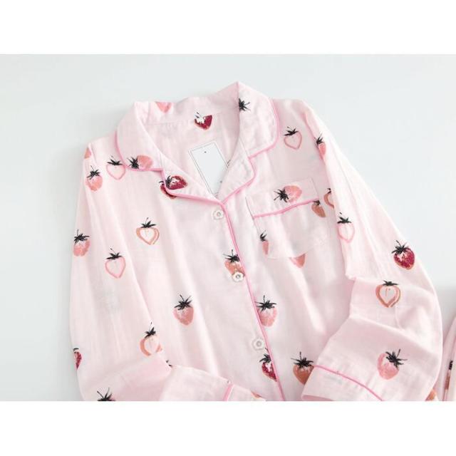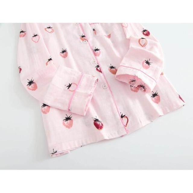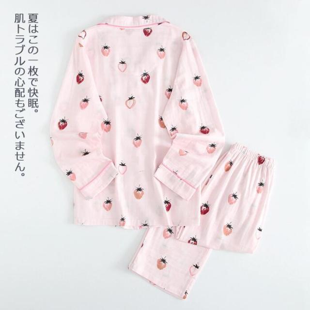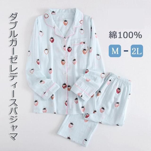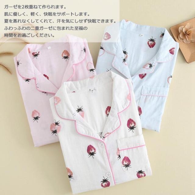 パジャマ レディース ルームウェア レディース 夏 ルームウェア セット レディース 2重ガーゼ パジャマ 綿100% 女性 ナイトウェア 長袖長ズボン 前開き 上下セット イチゴ柄 ポケット付き 部屋着 敏感肌 通気性がよく蒸れにくい 柔らかいので肌にやさしい 母の日 敬老の日