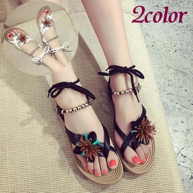 ストラップサンダル レディース ローヒール 女性 ぺたんこ アンクルストラップ レースアップ 紐 フラワーモチーフ ビーズ 上品