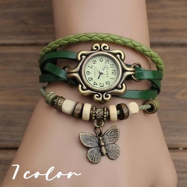 腕時計 ブレスレットウォッチ アナログ 丸型 ラウンド アンティーク調 レディース 女性 チャーム 蝶 ウッドビーズ レトロ 秒