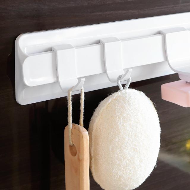 浮かせて収納することにより、取り付けた小物が壁面につきにくくカラっと乾くので清潔です。フックはスッと取り外せる曲線構造で、手元で使いたい時も簡単に取り外しが出来ます。