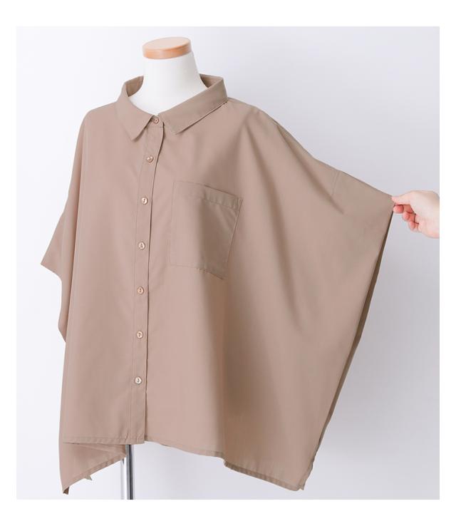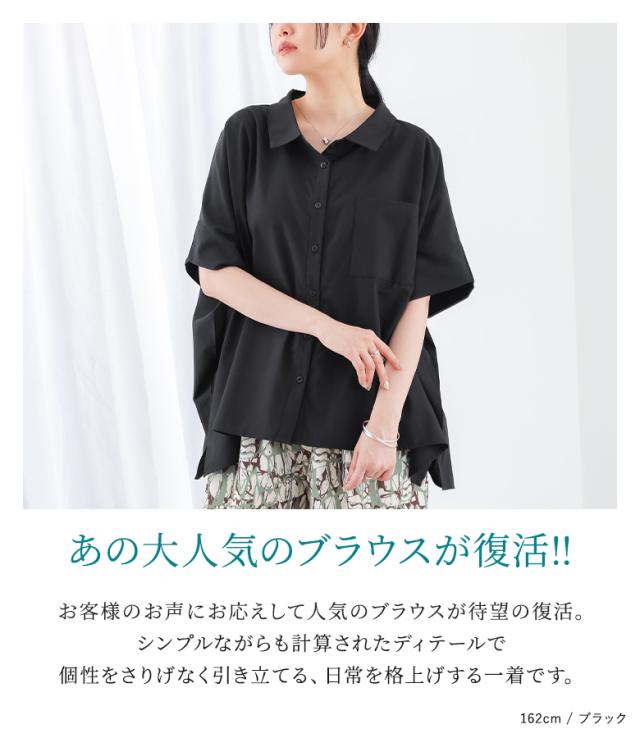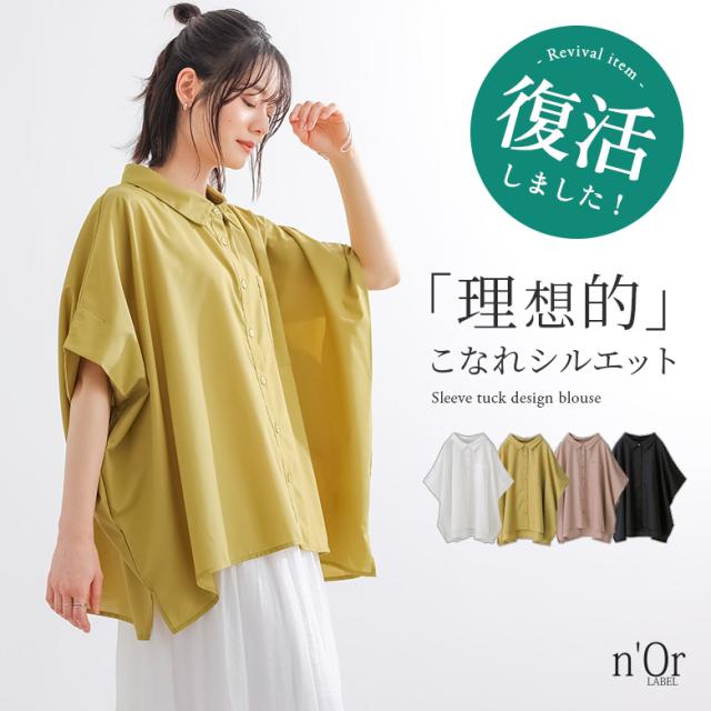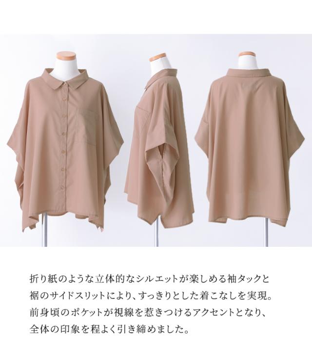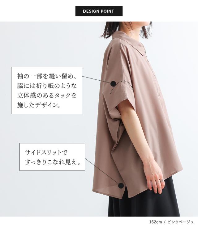 【P10倍】『袖タックデザインブラウス』 ※メール便可※【10】[ブラウス レディース 春 夏 トップス 半袖 五分袖 シャツ 襟付き レギュラーカラー 透け感 シアー タック スリット 無地 二の腕カバー 体型カバー 着痩せ]