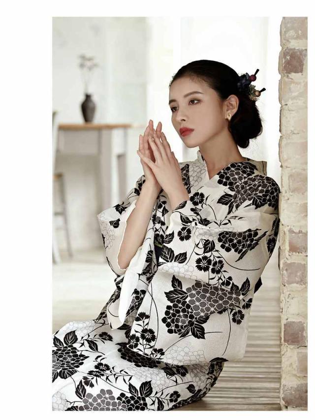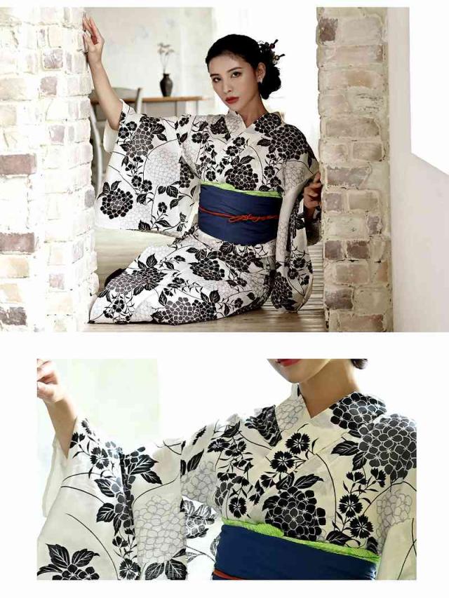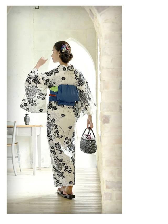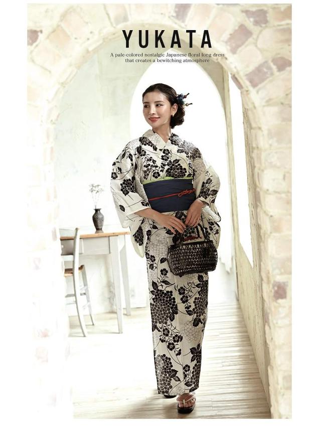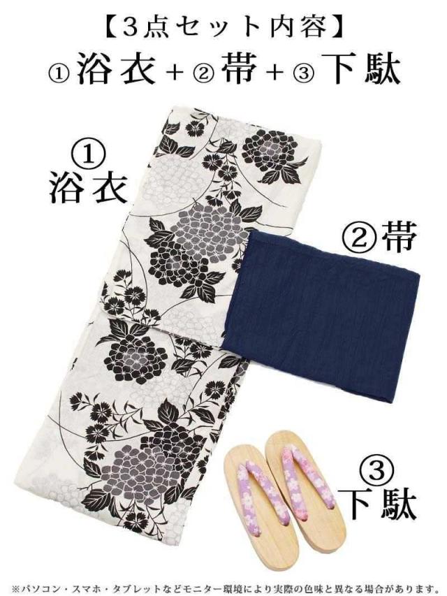 ☆白地ベースにクラシカルなモノトーンでまとめられた花柄浴衣は、紺色のしわ兵児帯と下駄がセットになったレディース浴衣セットになっています。