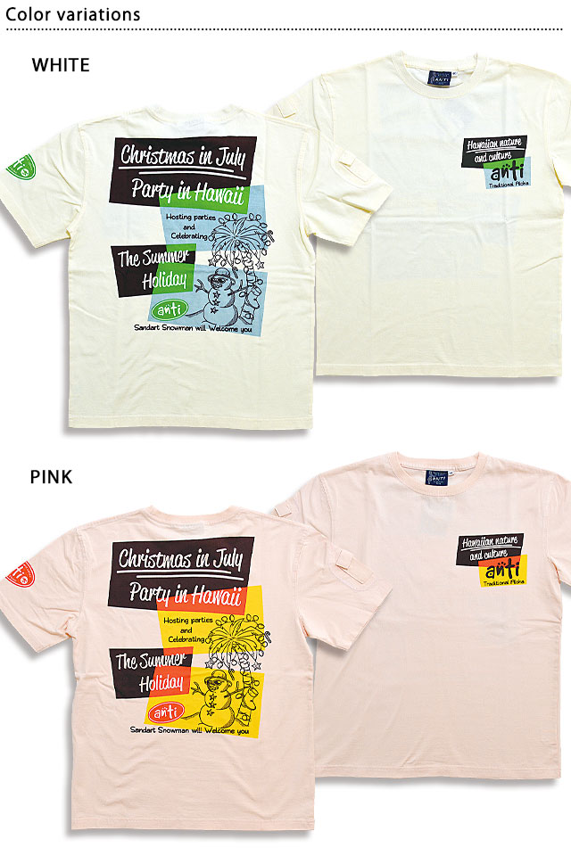 南国ハワイの伝統的な正装アロハシャツにテーマを見いだし、図柄をアレンジし落とし込んだ「ANTI」から「サマークリスマス半袖Tシャツ(ATT-160)」のご紹介です。 南国や南半球などのサマークリスマスを落とし込んだ半袖Tシャツがリリース! 生地には、肌触りの良いANTIさんお馴染みのよれにくいタフなボディーを採用。 | |||||||||||||||||||||||||