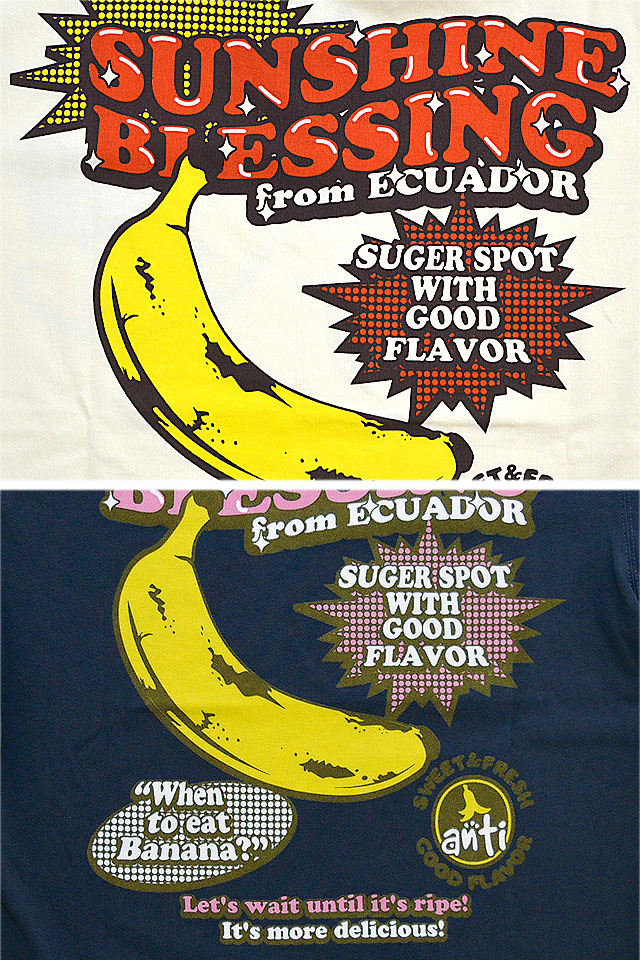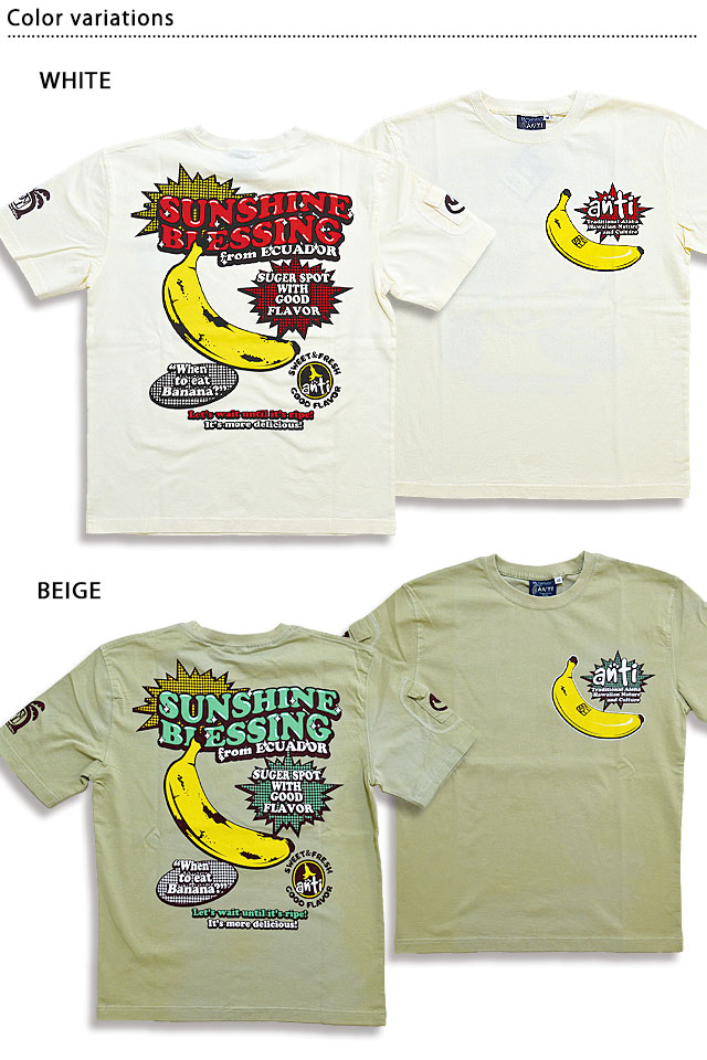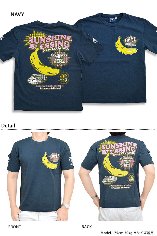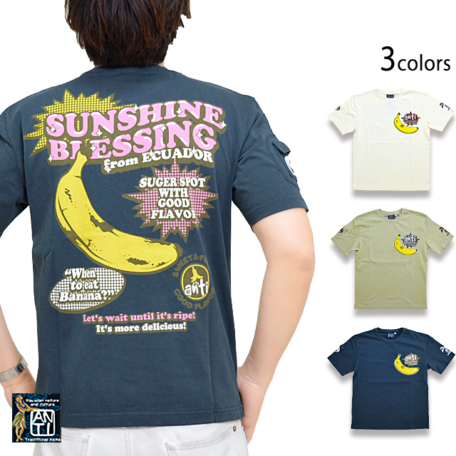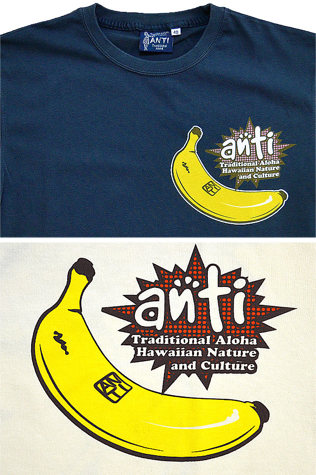 南国ハワイの伝統的な正装アロハシャツにテーマを見いだし、図柄をアレンジし落とし込んだ「ANTI」から「太陽の恵み半袖Tシャツ(ATT-161)」のご紹介です。 リゾート地でもなんだかんだで食べてしまうバナナをモチーフの主役に採用した半袖Tシャツ。 生地には、肌触りの良いANTIさんお馴染みのよれにくいタフなボディーを採用。 | |||||||||||||||||||||||||
