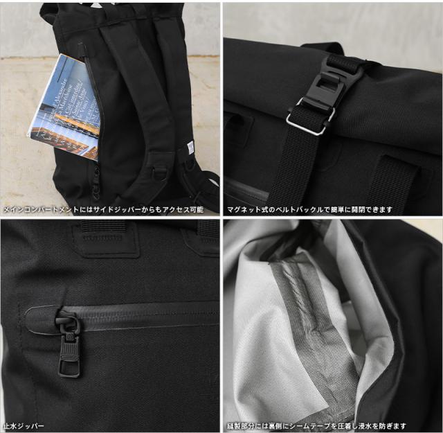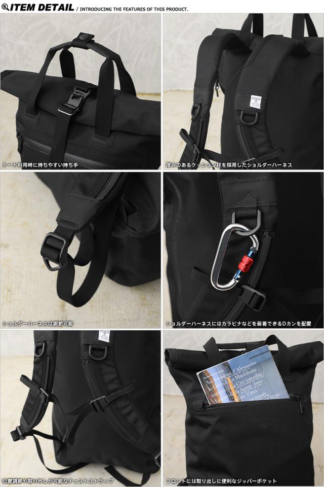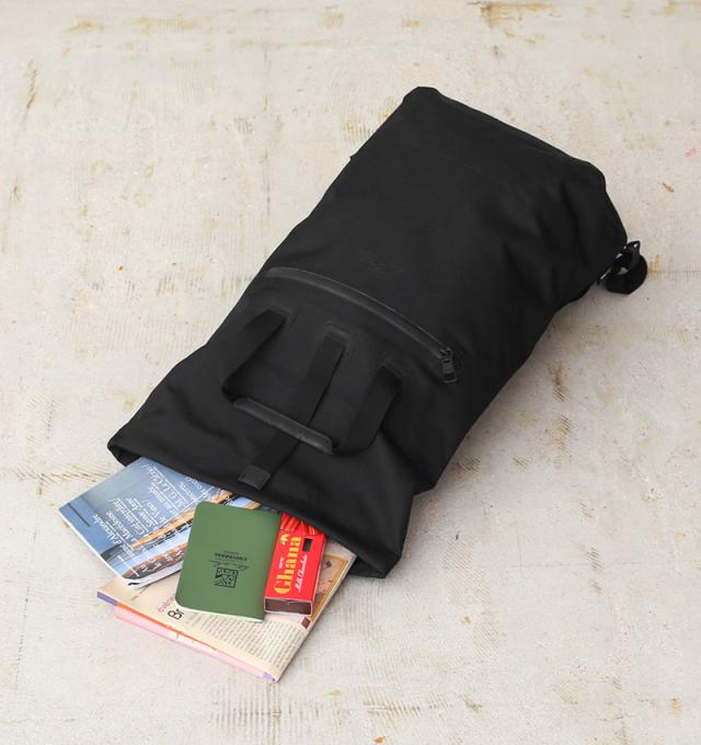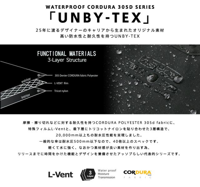 本体素材に特殊ポリエステル糸を使用したCORDURA POLYESTER 305d fabricを採用し、摩擦・引き裂き・すり切れ等に対する強度を備えています。さらに水蒸気を通し、雨風は通さない特性をもつ特殊透湿防水フィルムL-Ventをラミネート加工することで耐水性をさらに高め、最下層にトリコットナイロンを合わせた3レイヤード生地 「UNBY-TEX」で20,000mm以上もの耐水圧性能を実現しました。機能性と軽さが特徴で、突然の雨にも対応します。ややコンパクトなので、バックパックとしてはもちろんトートバッグとしても最適なサイズ感。シンプルなデザインと、こだわりぬかれたディテールと素材は幅広いシチュエーションでオススメできるアイテムです。