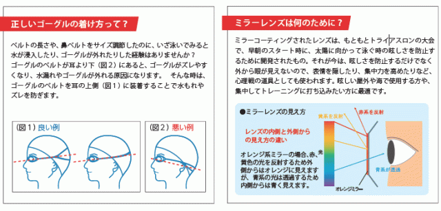 | 特徴 | ジュニア選手の為に進化した低抵抗ゴーグル。 ミラーレンズのレーシングモデルです。 子供の顔に合わせた専用設計。 顔の全面を通りゴーグル表面に発生する抵抗を 独自のデザインにより抑えることに成功しました。 ゴーグルの着脱時につかみやすい安全な形状。 紫外線カット、曇り止めレンズ、鼻ベルト4サイズ入り、 安心の日本製。 |