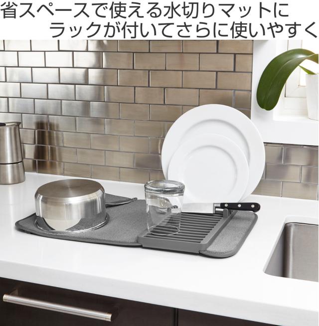 省スペースで使える水切り用吸水マットに樹脂製のラックが付いた、ラック付き水切りマットです。ラックがあることでプレートや鍋蓋などを立てられるので、乾きやすく、また水切りマットの容量を有効的に使うことができます。