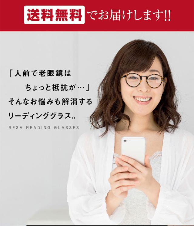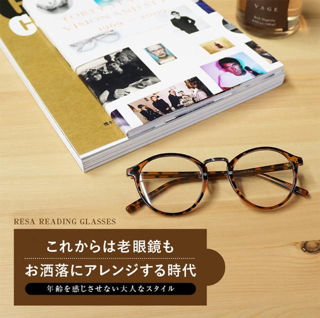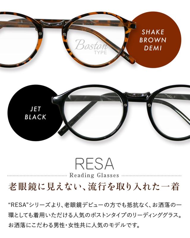 RESAシリーズより、老眼鏡デビューの方でも抵抗なく、お洒落の一環としても着用いただける人気のボストンタイプのリーディンググラス。