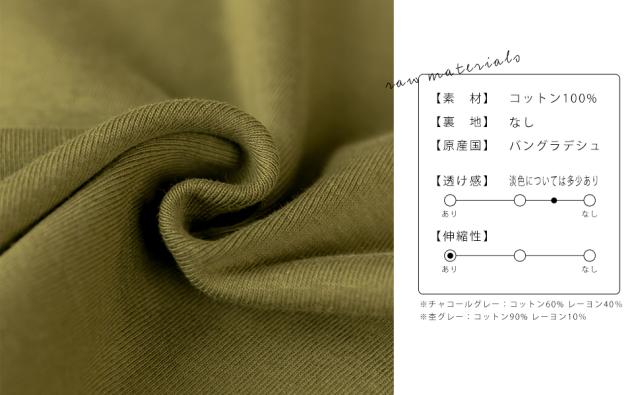 | 【素材】コットン100%※杢グレーのみ コットン90%/レーヨン10%※チャコールグレーのみ コットン60%/レーヨン40% 【裏地】なし【透け感】淡色については多少あり【伸縮性】あり【原産国】バングラデシュ |