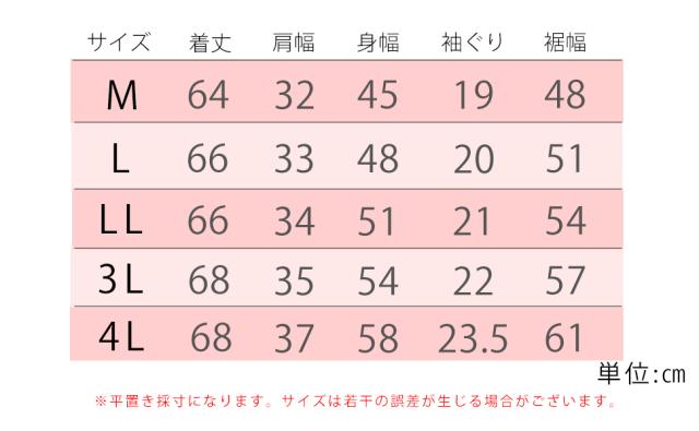 | [Mサイズ]着丈:64cm、肩幅:32cm、身幅:45cm、袖ぐり:19cm、裾幅:48cm [Lサイズ]着丈:66cm、肩幅:33cm、身幅:48cm、袖ぐり:20cm、裾幅:51cm [LLサイズ]着丈:66cm、肩幅:34cm、身幅:51cm、袖ぐり:21cm、裾幅:54cm [3Lサイズ]着丈:68cm、肩幅:35cm、身幅:54cm、袖ぐり:22cm、裾幅:57cm [4Lサイズ]着丈:68cm、肩幅:37cm、身幅:58cm、袖ぐり:23.5cm、裾幅:61cm ※平置き実寸サイズとなります為、若干の誤差が生じる場合がございます。 |