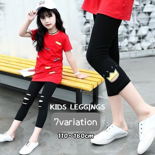 レギンス スパッツ 子供用 キッズ ジュニア 女の子 男の子 7分丈 サイドライン ロゴ ダメージ 穴あき 王冠 レッグウェア