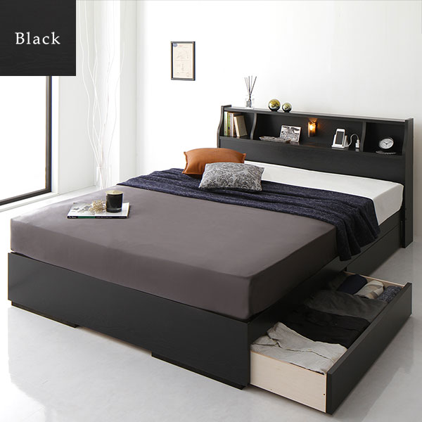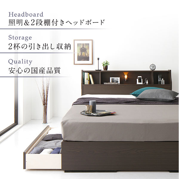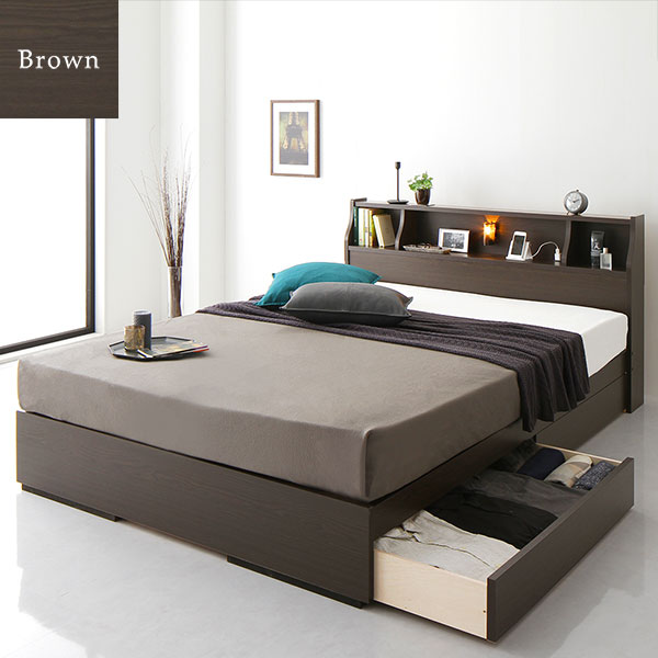 ベッド セミダブル 海外製ポケットコイルマットレス付き 片面仕様 ブラウン 収納付き 木製 棚付き コンセント付き 日本製フレーム 【北海道・沖縄・離島配送不可】