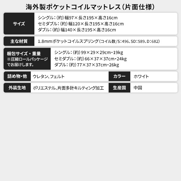 海外製ポケットコイルマットレス(片面仕様)