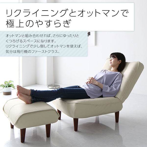 オットマンと組み合わせれば、さらにゆったりとくつろげるスペースに。リクライニングで少し倒してオットマンを使えば、気分は飛行機のファーストクラスです。