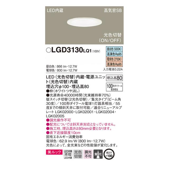 Panasonic パナソニック LGD3130 LQ1 天井埋込型 LED(昼白色・電球色) ダウンライト【光色切替タイプ・浅型8H】