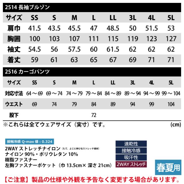 ジーベック XEBEC 作業服 上下セット 2514 長袖ブルゾンM-3L と 2516 カーゴパンツ SS-3L 春夏用 作業着 ズボン