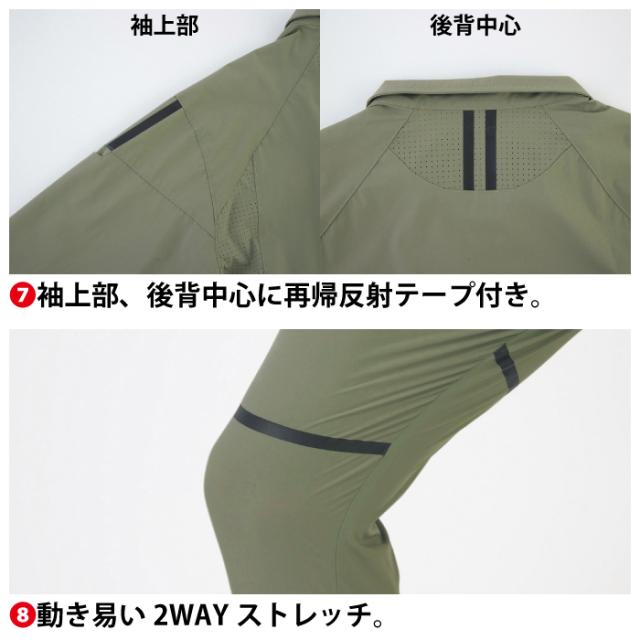 ◇機能:動きやすい2WAYストレッチ。左胸ファスナーポケット。左袖ペン差し。袖脇リブ仕様でタイトなシルエット。袖口リブ仕様。パンチング切替で通気性抜群。袖上部・後背中中心の再帰反射テープ付き。
