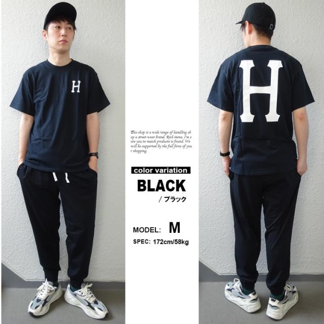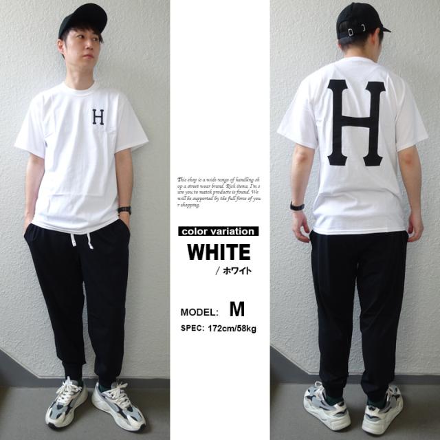 フロントとバックにアイコン「H」ロゴがデザインされた半袖Tシャツ。