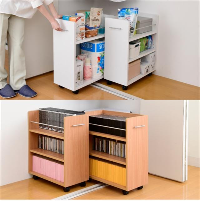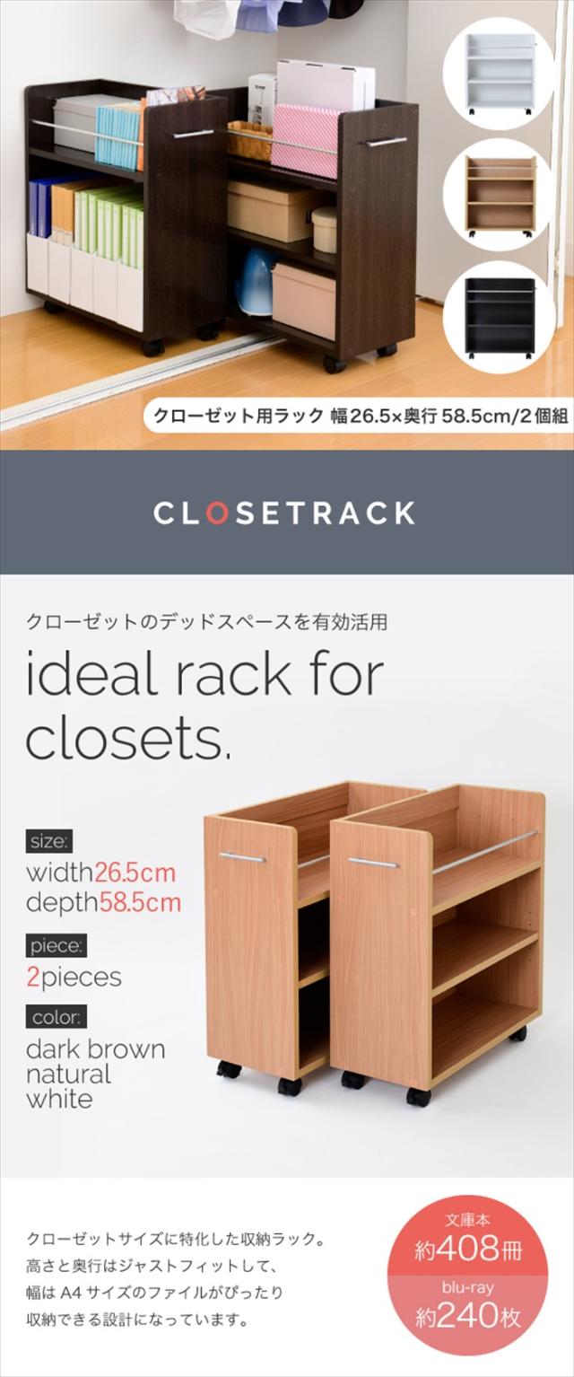 | キャスター付きの便利なクローゼットラック2個組。 取っ手はどちらにも取り付け可能なので、収納箇所の向きは左右入れ替えできます。 A4ファイルがぴったり収納できるよう設計された幅26.5cm。 本やメディア類や、日用品のストックなどの収納にぴったり。 クローゼット内のスペースを有効活用できるのでお部屋をすっきり片付けられます。 |