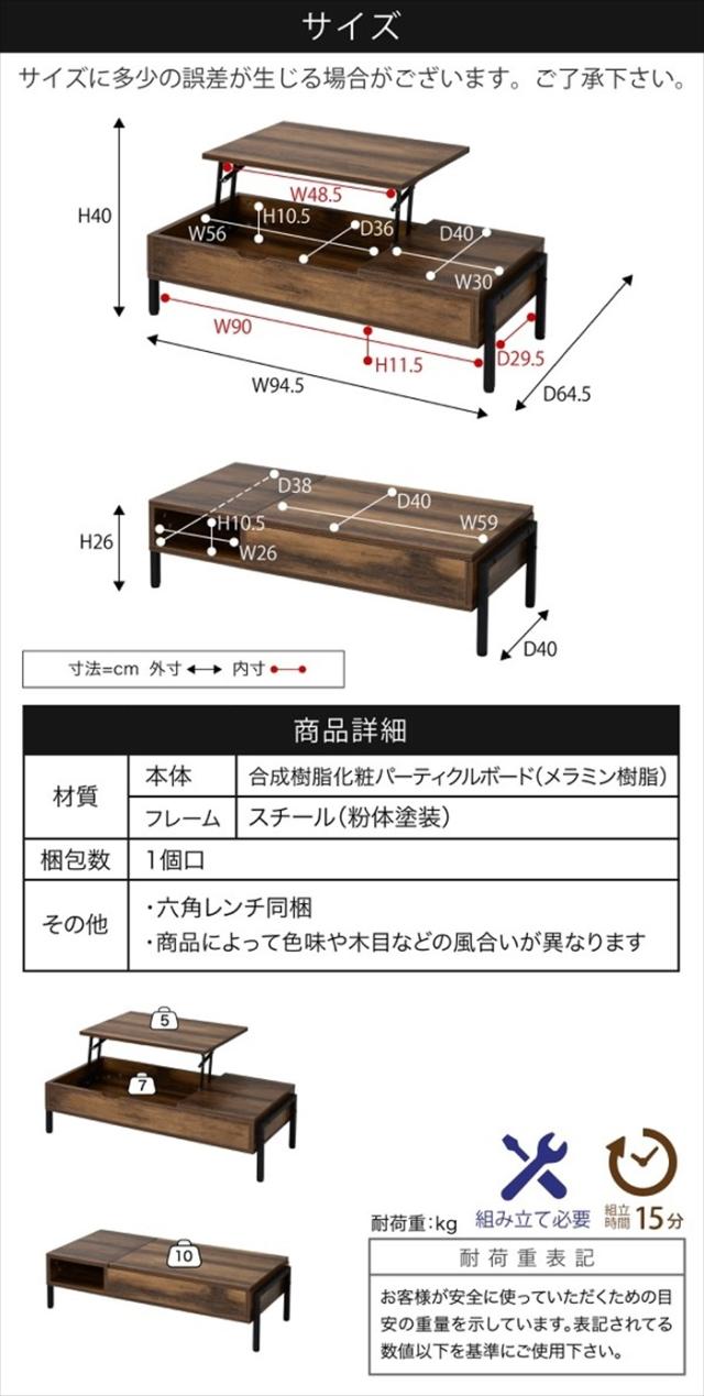 | [内寸] (リフト部天板)約幅59×奥行40cm (天板内収納部)約幅48.5(有効56)×奥行36cm×高さ10.5cm (オープン部上天板)約幅30×奥行40cm (オープン部)約幅26×奥行38×高さ10.5cm (脚間)約幅90×奥行29.5×高さ11.5cm |